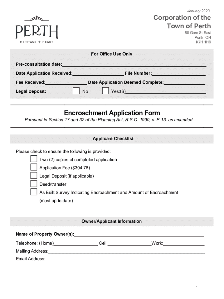 January 2023Corporation of the Town of Perth80 Gore St East Perth, ON K7H 1H9For Office Use Only Preconsultation date:___ Date Application Received:___ File Number:___ Fee Received:___ Date Application