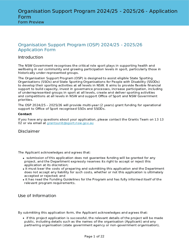 Organisation Support Program 2024/25 2025/26 Application Form Form PreviewOrganisation Support Program (OSP) 2024/25 2025/26 Application Form Introduction The NSW Government recognises the critical