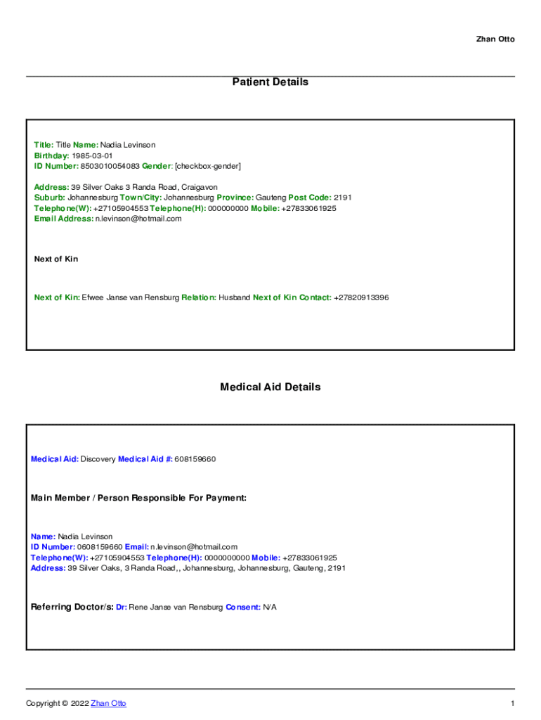 Zhan OttoPatient DetailsTitle: Title Name: Nadia Levinson Birthday: 19850301 ID Number: 8503010054083 Gender: [checkboxgender] Address: 39 Silver Oaks 3 Randa Road, Craigavon Suburb: Johannesburg