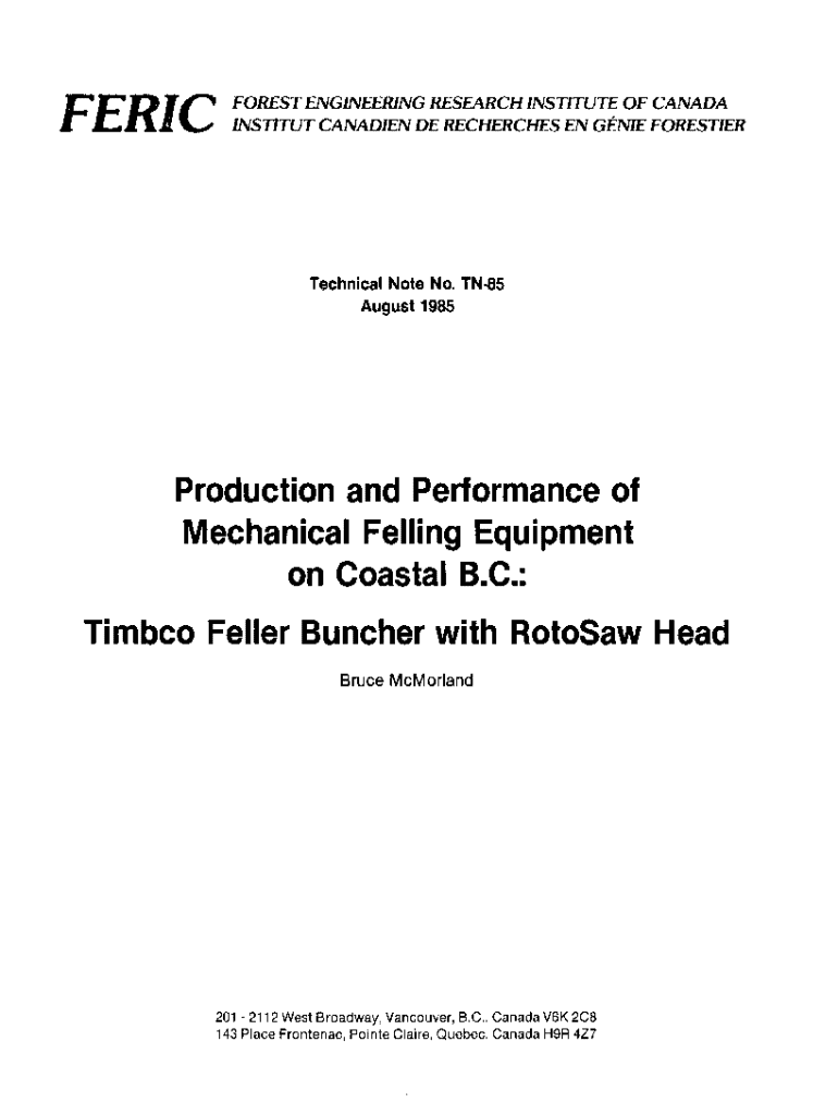 PI7DrFOREST ENGINEERING RESEARCH INSTITUTE OF CANADA INSTITUT CANADIEN DE RECHERCHES EN GENIE FORESTIERTechnical Note No. TN85 August 1985Production and Performance of Mechanical Felling Equipment