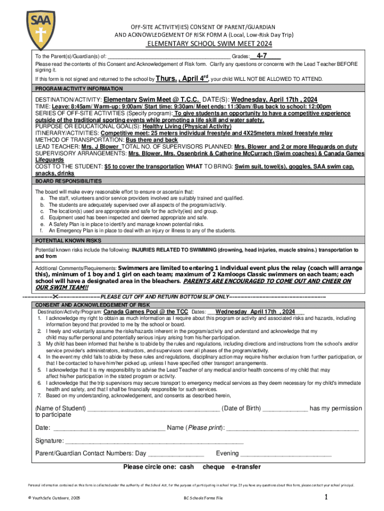 This form is a consent and acknowledgment of risk for parents and guardians regarding their child\'s participation in the Elementary Swim Meet scheduled for April 17, 2024. It outlines the event details, transportation, safety measures, and potential risks associated with swimming activities. Parents must sign and return the form by April 4, 2024, for their child to partake in this off-site activity.