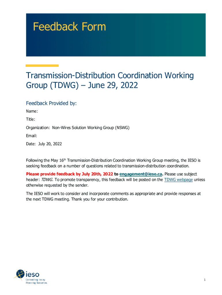 This document is a feedback form for participants of the Transmission-Distribution Coordination Working Group (TDWG) to provide their input following the meeting held on May 16, 2022. It seeks feedback on various topics related to transmission-distribution coordination and encourages contributions to promote transparency.