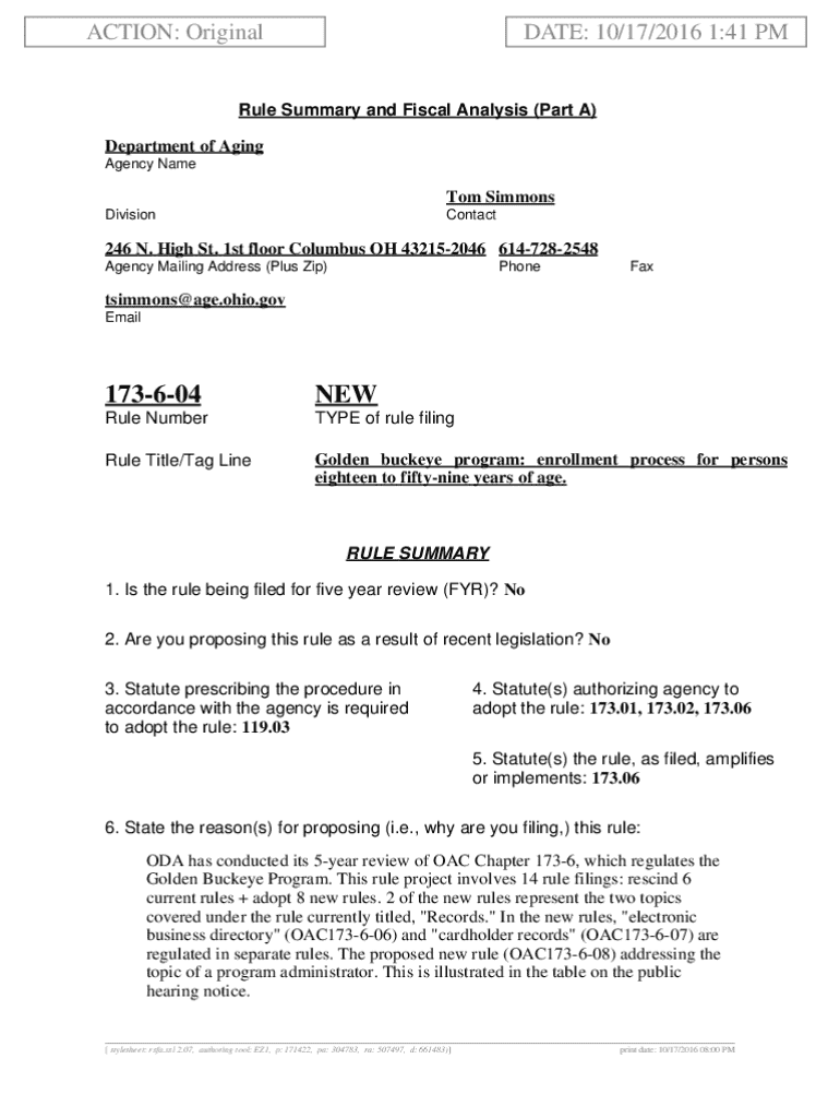 This document outlines the proposed new rule for the Golden Buckeye Program concerning the enrollment process for individuals aged eighteen to fifty-nine. It details changes from prior regulations, including a more succinct approach and direct contact requirements with the Ohio Department of Aging for card replacements.