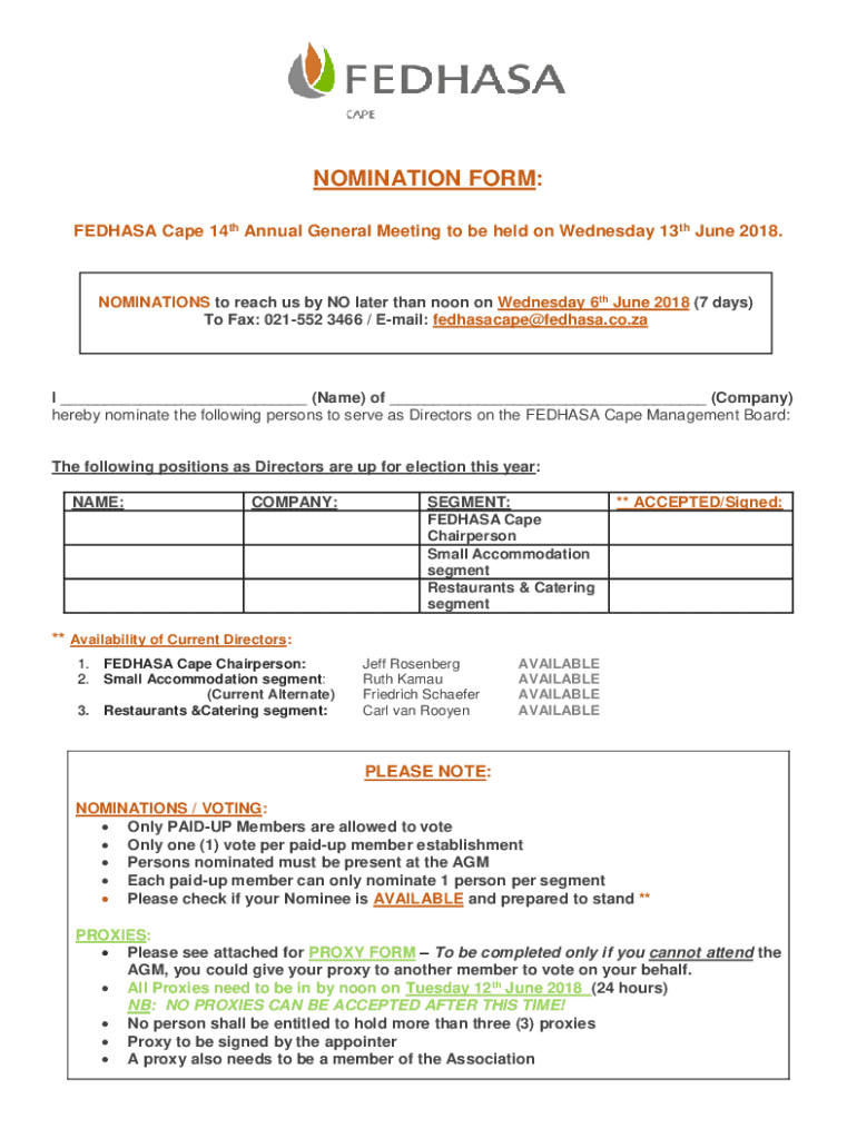 NOMINATION FORM: FEDHASA Cape 14th Annual General Meeting to be held on Wednesday 13th June 2018.NOMINATIONS to reach us by NO later than noon on Wednesday 6th June 2018 (7 days) To Fax: 021552 3466