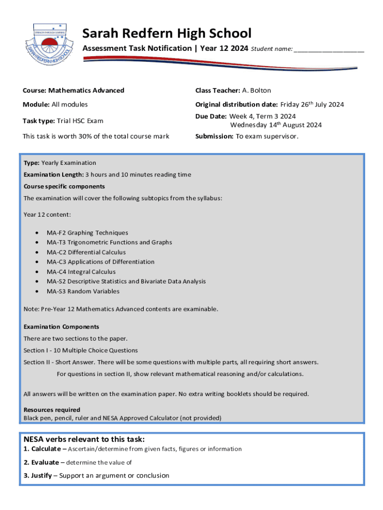 This document is a notification for the Year 12 Trial HSC Exam for Mathematics Advanced at Sarah Redfern High School. It includes details about the examination date, structure, content coverage, and resources required for students. The examination will assess various mathematical concepts including calculus, trigonometry, and statistical analysis, and is designed to evaluate students\' understanding and application of these topics.
