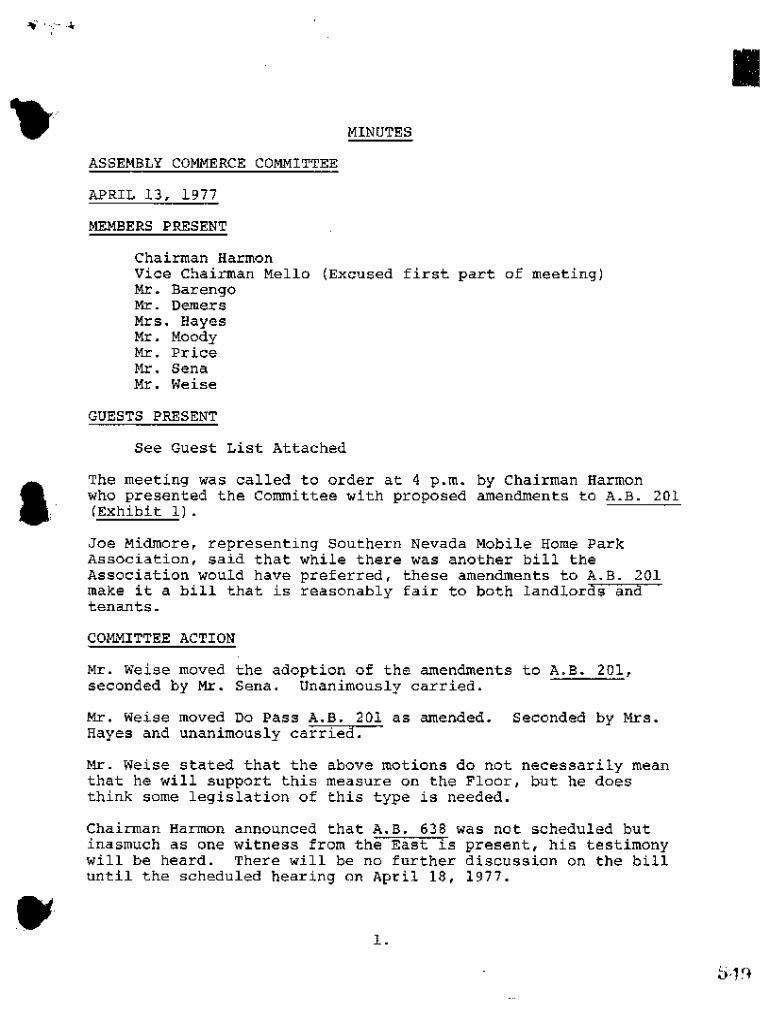 I MINUTES ASSEMBLY COMMERCE COMMITTEE APRIL 13, 1977 MEMBERS PRESENT Chairman Harmon Vice Chairman Mello (Excused first part of meeting) Mr. Barengo Mr. Demers Mrs. Hayes Mr. Moody Mr. Price Mr. Sena