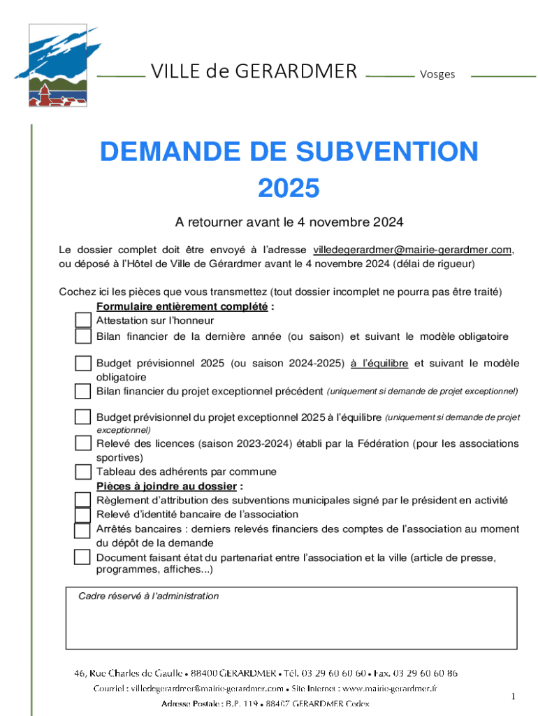 VILLE de GERARDMERVosgesDEMANDE DE SUBVENTION 2025 A retourner avant le 4 novembre 2024 Le dossier complet doit tre envoy ladresse villedegerardmer@mairiegerardmer.com, ou dpos lHtel de Ville de Grardmer