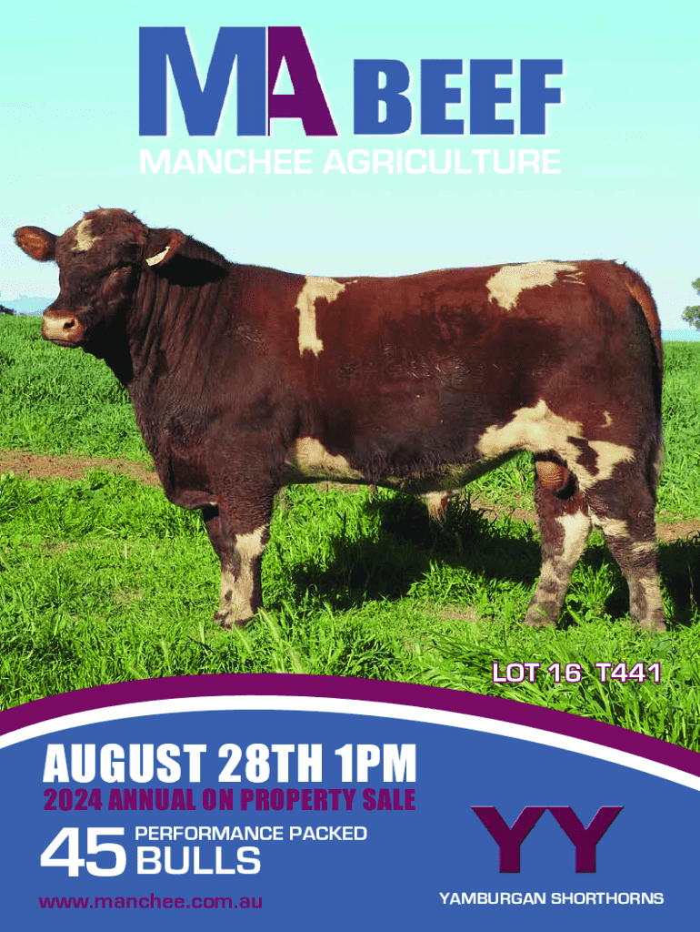 LOT 16 T441AUGUST 28TH 1PM 2024 ANNUAL ON PROPERTY SALE45 BULLSPERFORMANCE PACKEDwww.manchee.com.auYAMBURGAN SHORTHORNSLOT 1 YY T121LOT 3 YY T448LOT 4 YY T157LOT 5 YY T179LOT 10 YY T162LOT 11 YY T132LOT