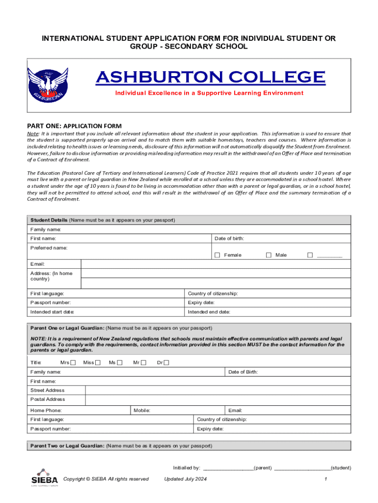 INTERNATIONAL STUDENT APPLICATION FORM FOR INDIVIDUAL STUDENT OR GROUP SECONDARY SCHOOLASHBURTON COLLEGE Individual Excellence in a Supportive Learning EnvironmentPART ONE: APPLICATION FORMNote: It