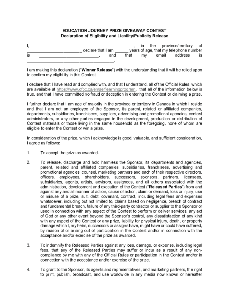 EDUCATION JOURNEY PRIZE GIVEAWAY CONTEST Declaration of Eligibility and Liability/Publicity Release I, ___, in the province/territory of ___ declare that I am ___ years of age, that my telephone number