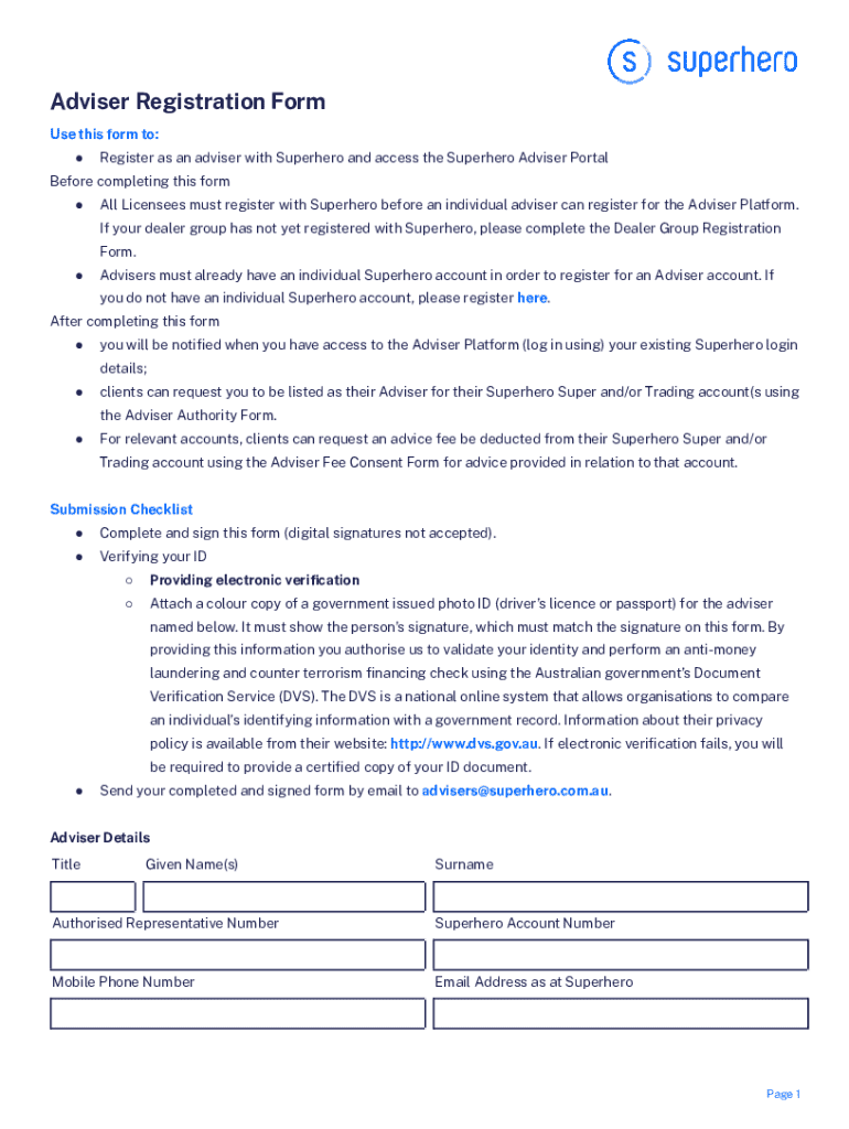 Adviser Registration Form Use this form to: Register as an adviser with Superhero and access the Superhero Adviser PortalBefore completing this form All Licensees must register with Superhero before