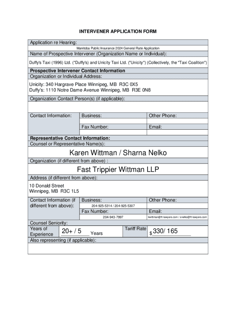 INTERVENER APPLICATION FORM Application re Hearing: Manitoba Public Insurance 2024 General Rate ApplicationName of Prospective Intervener (Organization Name or Individual): Duffy\'s Taxi (1996) Ltd.