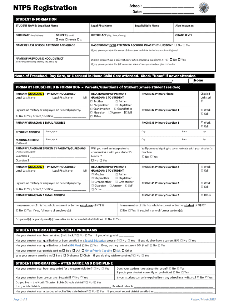 This document provides information for parents/guardians registering their child for school in the North Thurston Public Schools district. It outlines necessary documents required for registration, important health information, residency verification, and includes forms for military affiliation, student health history, and various student data collection processes.