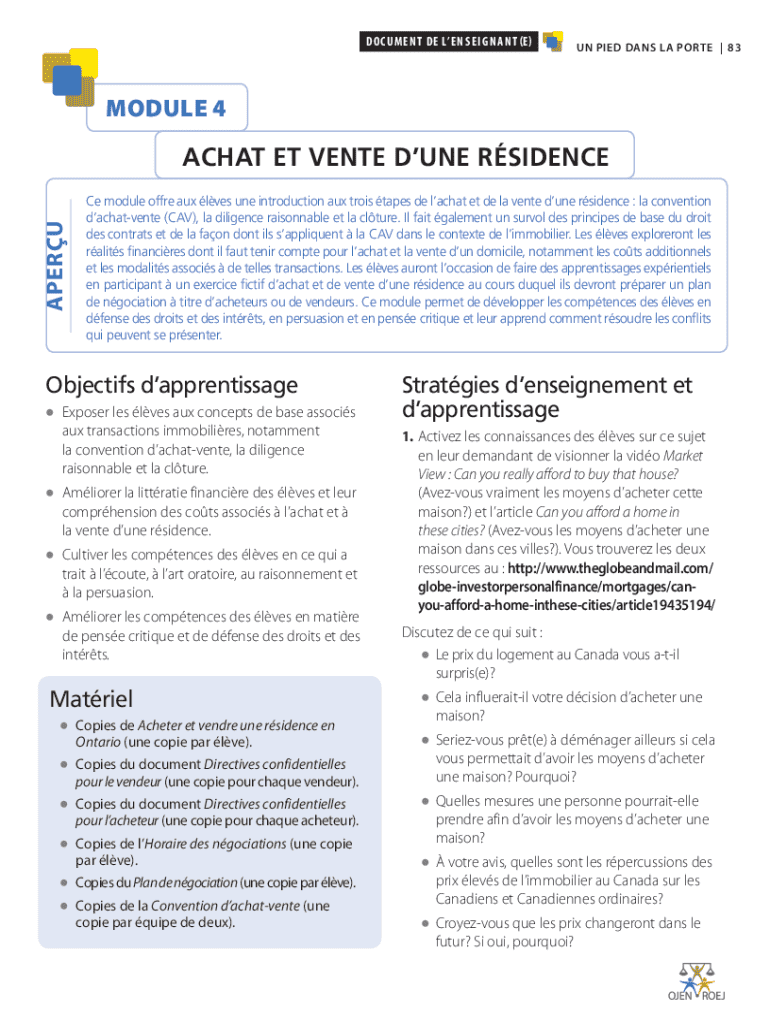 Document de le n s e i g n a n t (e)UN PIED DANS LA PORTE | 8 3Module 4AperuACHAT ET VENTE DUNE RSIDENCE Ce module offre aux lves une introduction aux trois tapes de lachat et de la vente dune rsidence