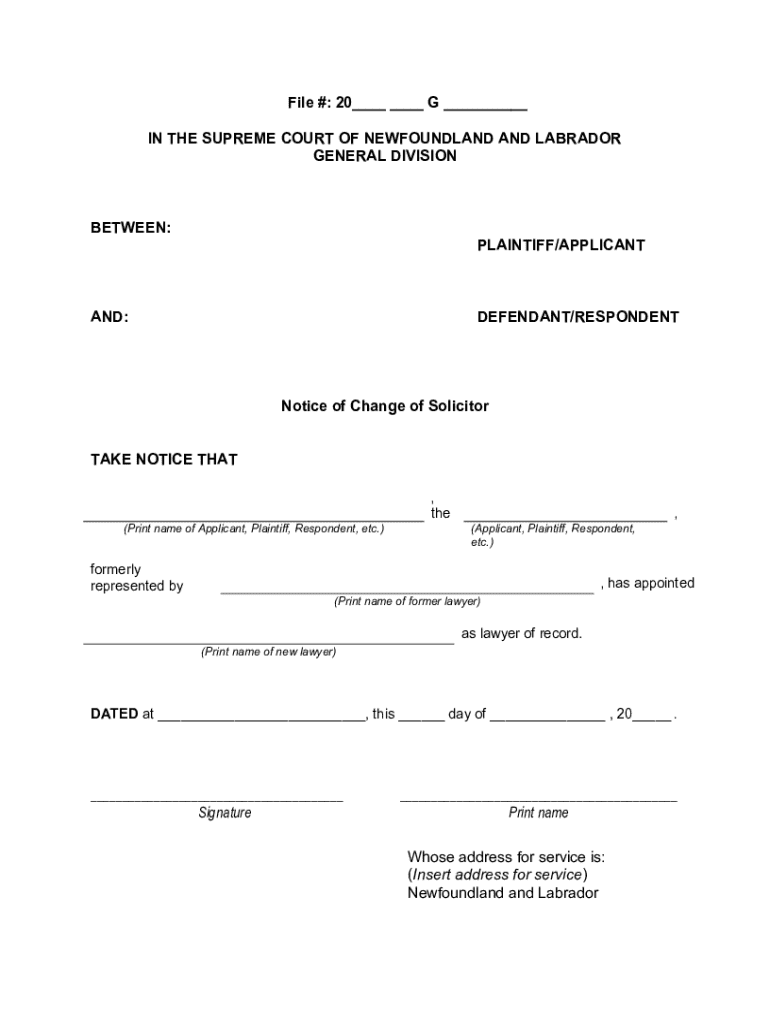This document serves as a formal notice to inform the court and relevant parties of a change in legal representation for the applicant, plaintiff, or respondent in a legal matter within the Supreme Court of Newfoundland and Labrador.