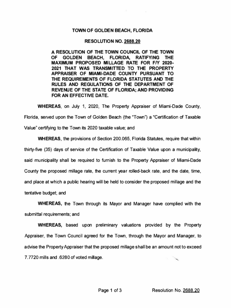 TOWN OF GOLDEN BEACH, FLORIDA RESOLUTION NO. 2688.20 A RESOLUTION OF THE TOWN COUNCIL OF THE TOWN OF GOLDEN BEACH, FLORIDA, RATIFYING THE MAXIMUM PROPOSED MILLAGE RATE FOR F/Y 20202021 THAT WAS TRANSMITTED
