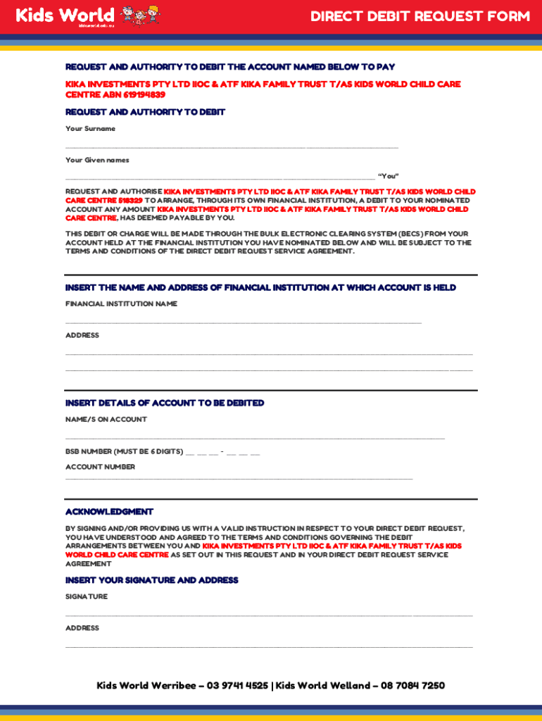 DIRECT DEBIT REQUEST FORMREQUEST AND AUTHORITY TO DEBIT THE ACCOUNT NAMED BELOW TO PAY KIKA INVESTMENTS PTY LTD IIOC & ATF KIKA FAMILY TRUST T/AS KIDS WORLD CHILD CARE CENTRE ABN 619194839 REQUEST