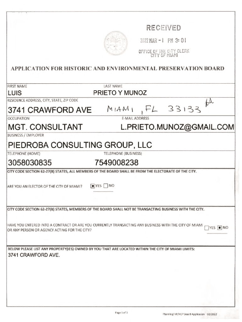 RE C E W E D 12[ 22 MAR PM 3: 01OFFiCE OF THE CITY CLERK CITY OF MIAMIAPPLICATIONFOR HISTORICAND ENVIRONMENTALBOARDLAST NAMEFIRST NAMEPRIETO Y MUNOZLUIS RESIDENCEPRESERVATION1CITY, STATE, ZIP CODEADDRESS,1