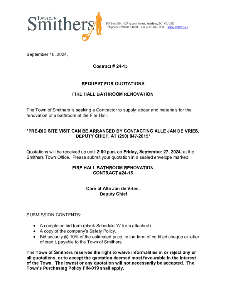 PO Box 879, 1027 Aldous Street, Smithers, BC V0J 2N0 Telephone (250) 8471600 Fax (250) 8471601 www.smithers.caSeptember 16, 2024, Contract # 2415 REQUEST FOR QUOTATIONS FIRE HALL BATHROOM RENOVATION