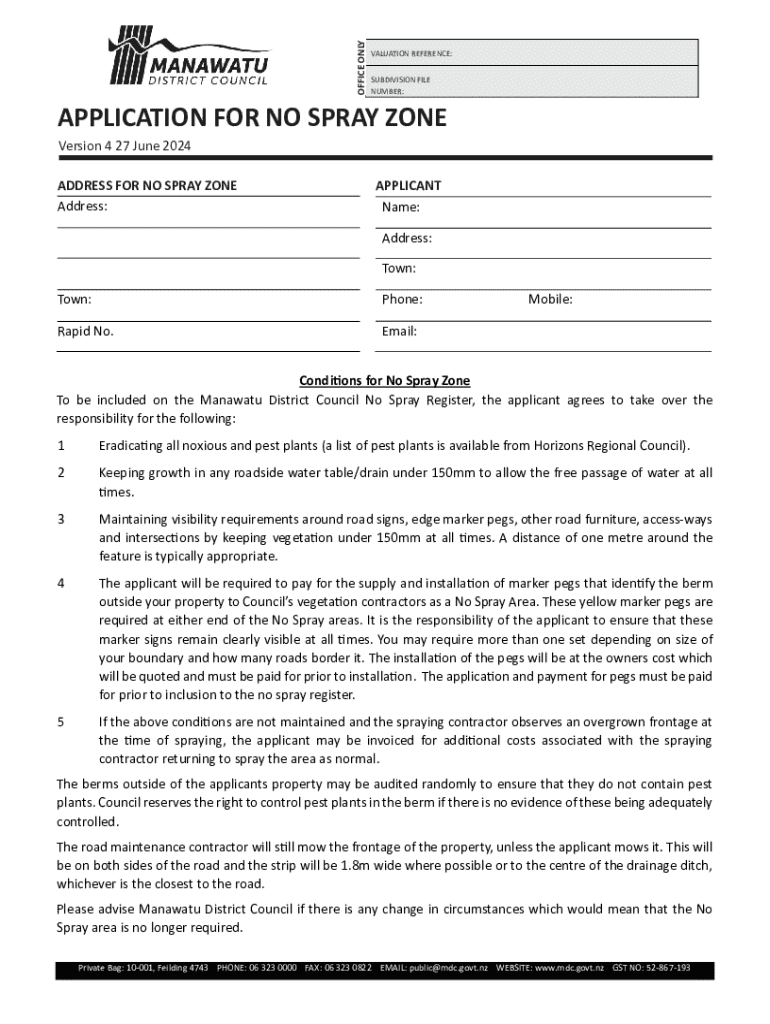 OFFICE ONLYVALUATION REFERENCE: SUBDIVISION FILE NUMBER:APPLICATION FOR NO SPRAY ZONE Version 4 27 June 2024 ADDRESS FOR NO SPRAY ZONE Address:APPLICANT Name: Address: Town:Town:Phone:Rapid No.Email:Mobile:Condi