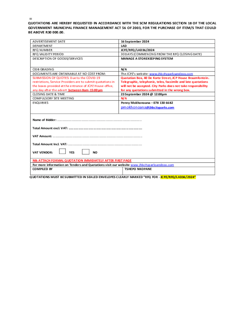This document is a Request for Quotation (RFQ) for the procurement of a storekeeping system in accordance with SCM regulations and the Local Government Municipal Finance Management Act. It details the requirements for bidders, the submission process, and compliance documentation needed to ensure a valid bid submission. The document also outlines evaluation criteria and penalties for non-compliance.
