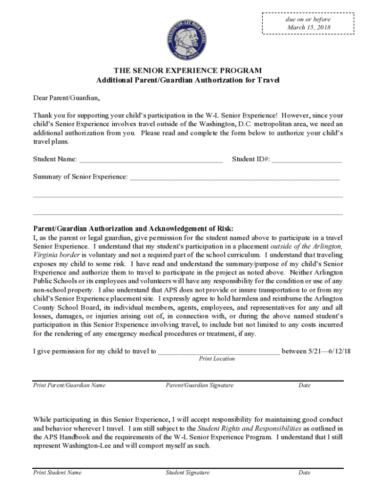 This document serves as an authorization form for parents or guardians to grant permission for their child to participate in the Senior Experience Program, involving travel outside of the Washington, D.C. metropolitan area. It outlines the risks involved and the responsibilities of both the student and their guardians.
