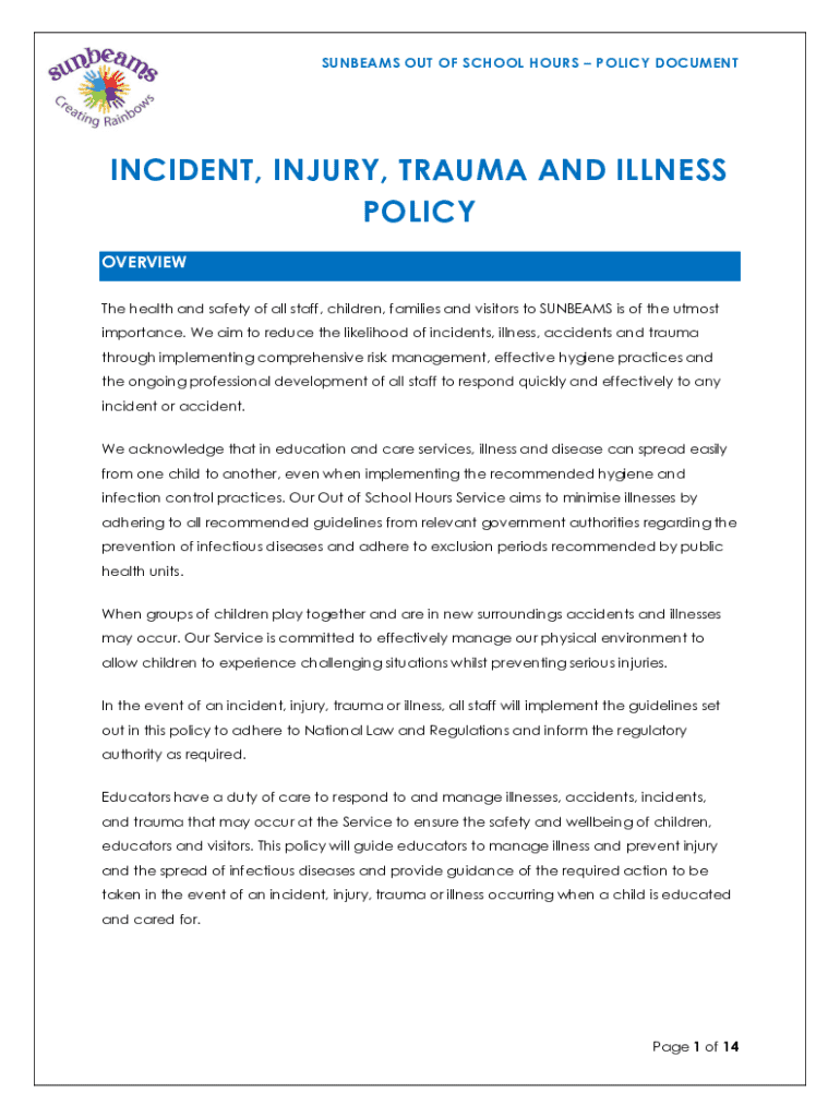 SUNBEAMS OUT OF SCHOOL HOURS POLICY DOCUMENTINCIDENT, INJURY, TRAUMA AND ILLNESS POLICY OVERVIEW The health and safety of all staff, children, families and visitors to SUNBEAMS is of the utmost importance.