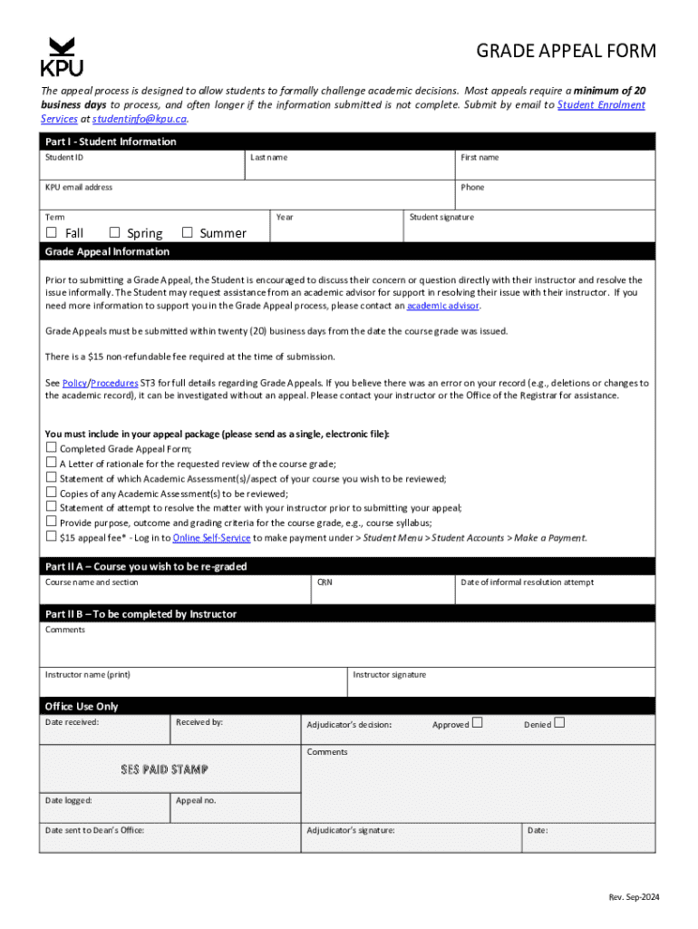 GRADE APPEAL FORM The appeal process is designed to allow students to formally challenge academic decisions. Most appeals require a minimum of 20 business days to process, and often longer if the