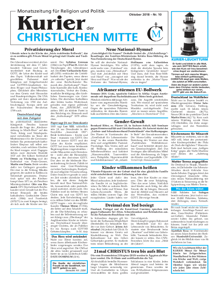 Monatszeitung fr Religion und PolitikKurierOktober 2018 Nr. 10derCHRISTLICHEN MITTE Privatisierung der MoralKURIER der CHRISTLICHEN MITTE, Lippstdter Strae 42, D59329 Liesborn Postvertriebsstck, Deutsche