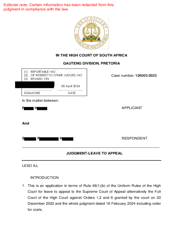 Editorial note: Certain information has been redacted from this judgment in compliance with the law.IN THE HIGH COURT OF SOUTH AFRICA GAUTENG DIVISION, PRETORIA (1) REPORTABLE: NO (2) OF INTEREST