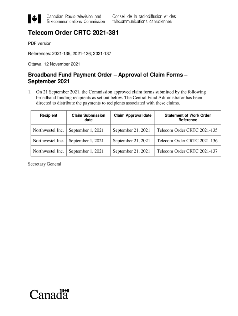 Telecom Order CRTC 2021381 PDF version References: 2021135; 2021136; 2021137 Ottawa, 12 November 2021Broadband Fund Payment Order Approval of Claim Forms September 2021 1.On 21 September 2021, the