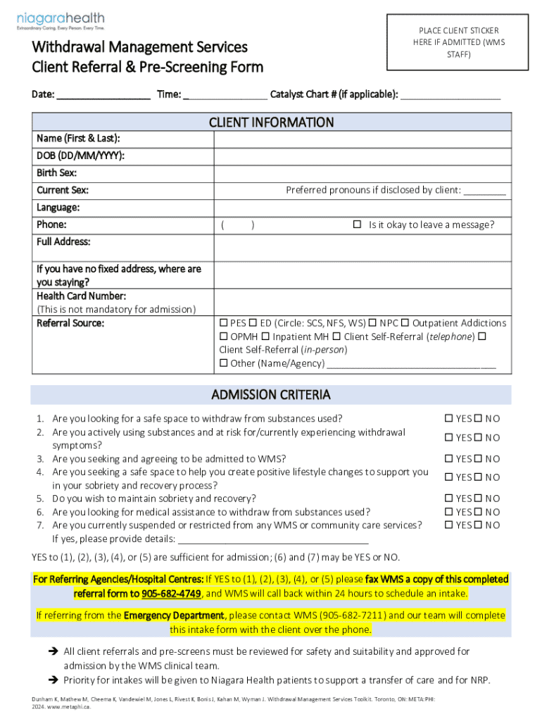 This form is utilized for client referrals and pre-screening for Withdrawal Management Services (WMS). It collects essential client information, admission criteria, substance use history, medical and mental health details, and consent for referral process, ensuring that clients meet safety and suitability requirements for admission to WMS.