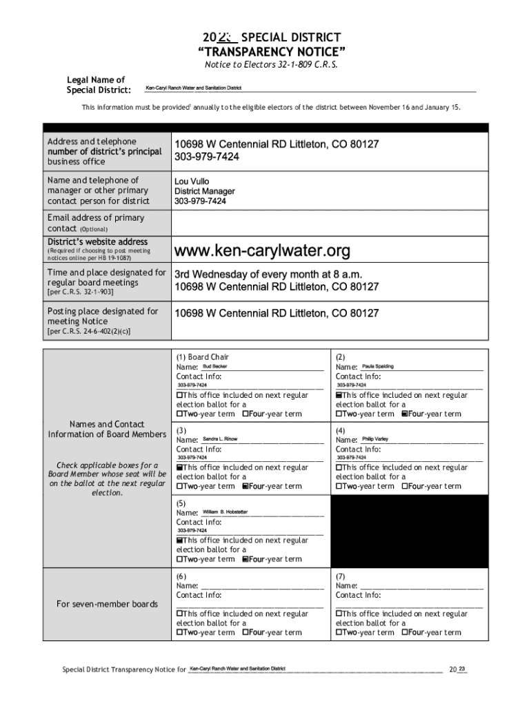 20___ SPECIAL DISTRICT Notice to Electors 321809 C.R.S. Legal Name of Special District:___This information must be provided1 annually to the eligible electors of the district between November 16 and