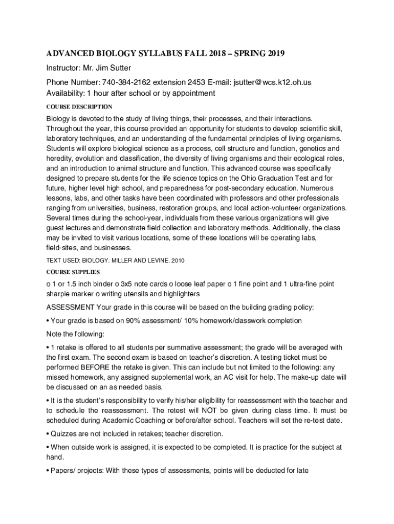 Get the free Advanced Biology Syllabus - hs wcs k12 oh