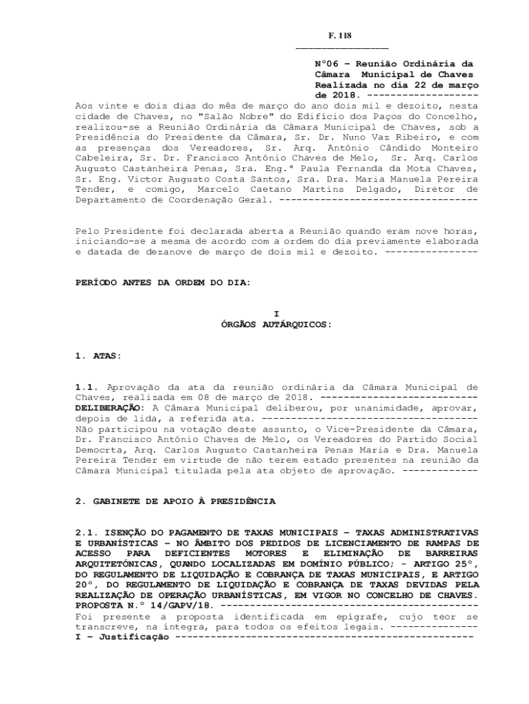 F. 118 ___N06 Reunio Ordinria da Cmara Municipal de Chaves Realizada no dia 22 de maro de 2018. Aos vinte e dois dias do ms de maro do ano dois mil e dezoito, nesta cidade de Chaves, no \"Salo Nobre\"