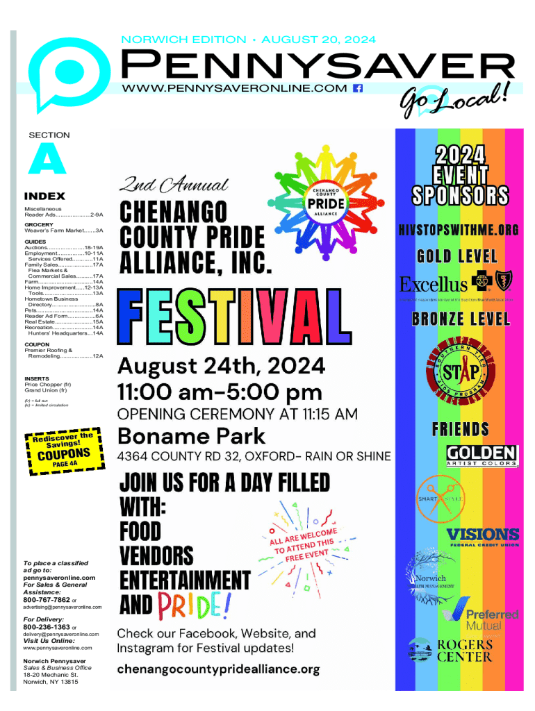 The Norwich Pennysaver is a local advertising and classifieds publication that allows individuals and businesses to post ads for goods, services, and events in Norwich, New York.