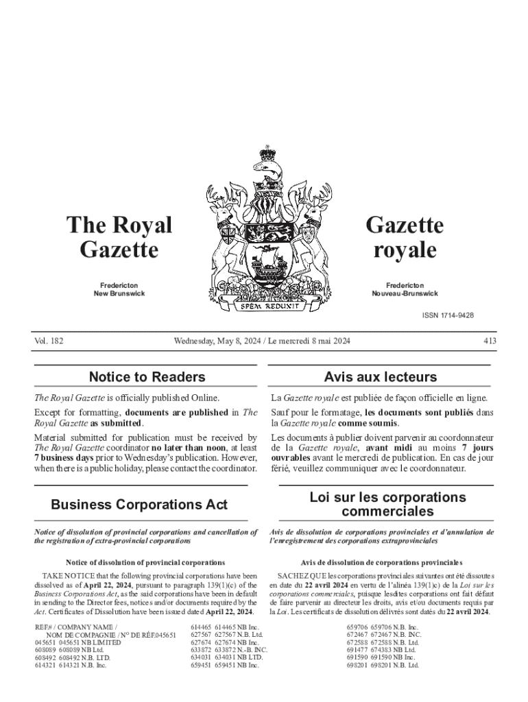 The Royal GazetteGazette royaleFredericton New BrunswickFredericton NouveauBrunswick ISSN 17149428Vol. 182413Wednesday, May 8, 2024 / Le mercredi 8 mai 2024Notice to ReadersAvis aux lecteursThe Royal