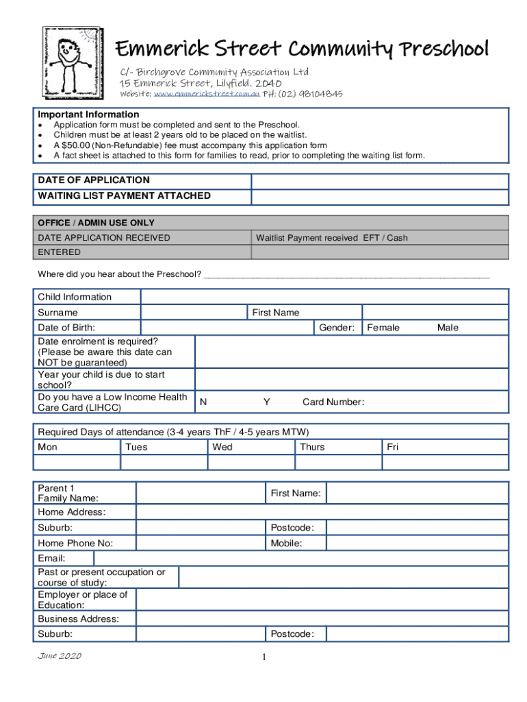 This document is an application form for parents to apply for their child to be placed on the waiting list for Emmerick Street Community Preschool. It includes important information regarding eligibility, fees, and the enrollment process for children aged 2 to 5 years old.