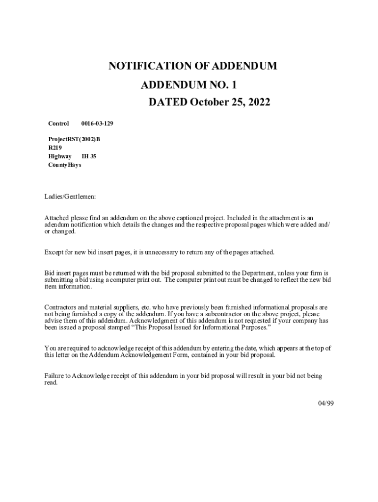 This document serves as a notification of addendum for project RST(2002)BR219, detailing the updates and changes made to the proposal pages. It outlines the necessary acknowledgments for bidders and requirements regarding the submission of bids. The addendum includes changes to scopes, instructions for bid submissions, and references specific Texas Department of Transportation regulations.