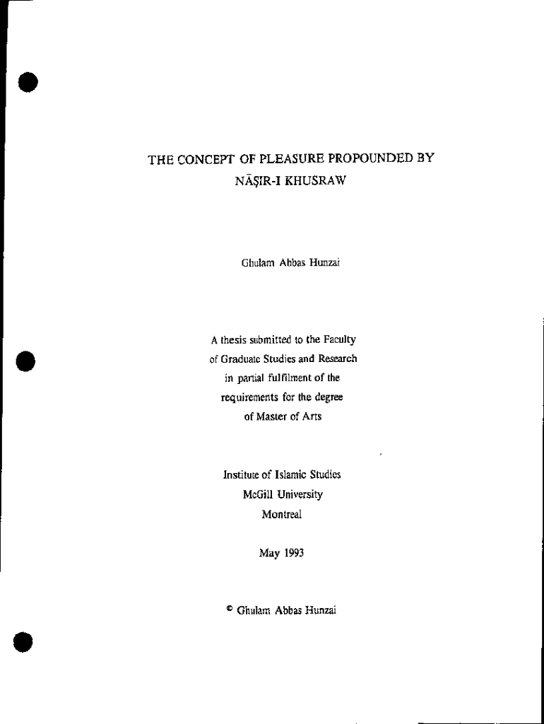 THE CONCEPT OF PLEASURE PROPOUNDED BYNASIRI KHUSRAWGhulam Abbas HunzaiA thesis submitte.d to the Facultyof Graduate Studies and Research in partial fulfilment of the requirements for the degree of