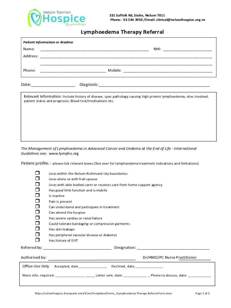 331 Suffolk Rd, Stoke, Nelson 7011 Phone: 03 546 3950 /Email: clinical@nelsonhospice.org.nzLymphoedema Therapy Referral Patient Information or BradmaName:___NHI: ___Address: ___ ___ Phone:___ Mobile: