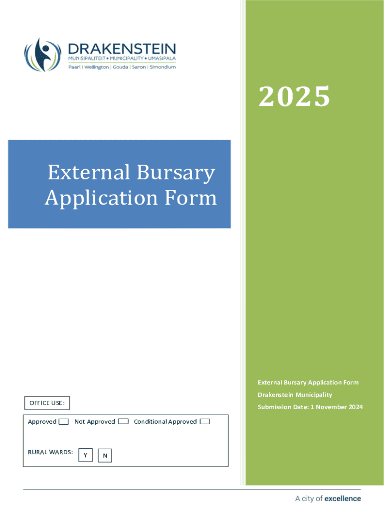 2025 External Bursary Application FormExternal Bursary Application FormDrakenstein Municipality OFFICE USE: ApprovedRURAL WARDS:Submission Date: 1 November 2024 Not ApprovedY E SNConditional ApprovedAPPLICATION