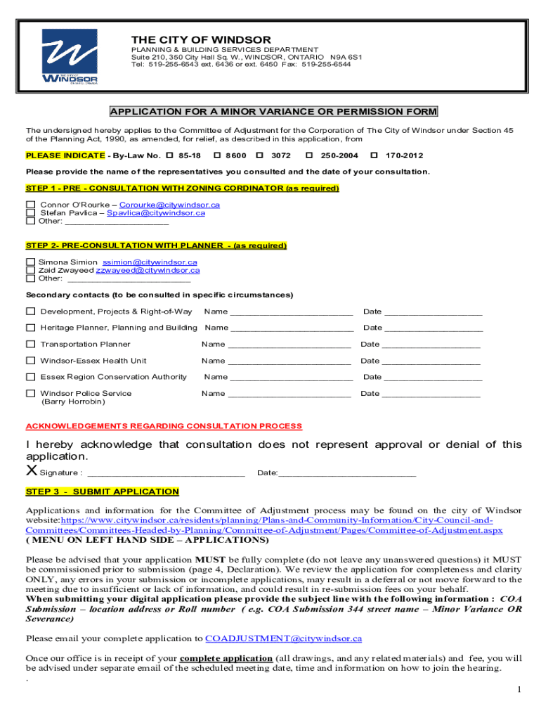THE CITY OF WINDSORPLANNING & BUILDING SERVICES DEPARTMENT Suite 210, 350 City Hall Sq. W., WINDSOR, ONTARIO N9A 6S1 Tel: 5192556543 ext. 6436 or ext. 6450 Fax: 5192556544APPLICATION FOR A MINOR VARIANCE