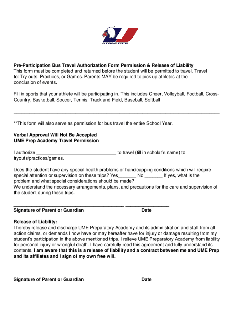 PreParticipation Bus Travel Authorization Form Permission & Release of Liability This form must be completed and returned before the student will be permitted to travel. Travel to: Tryouts, Practices,