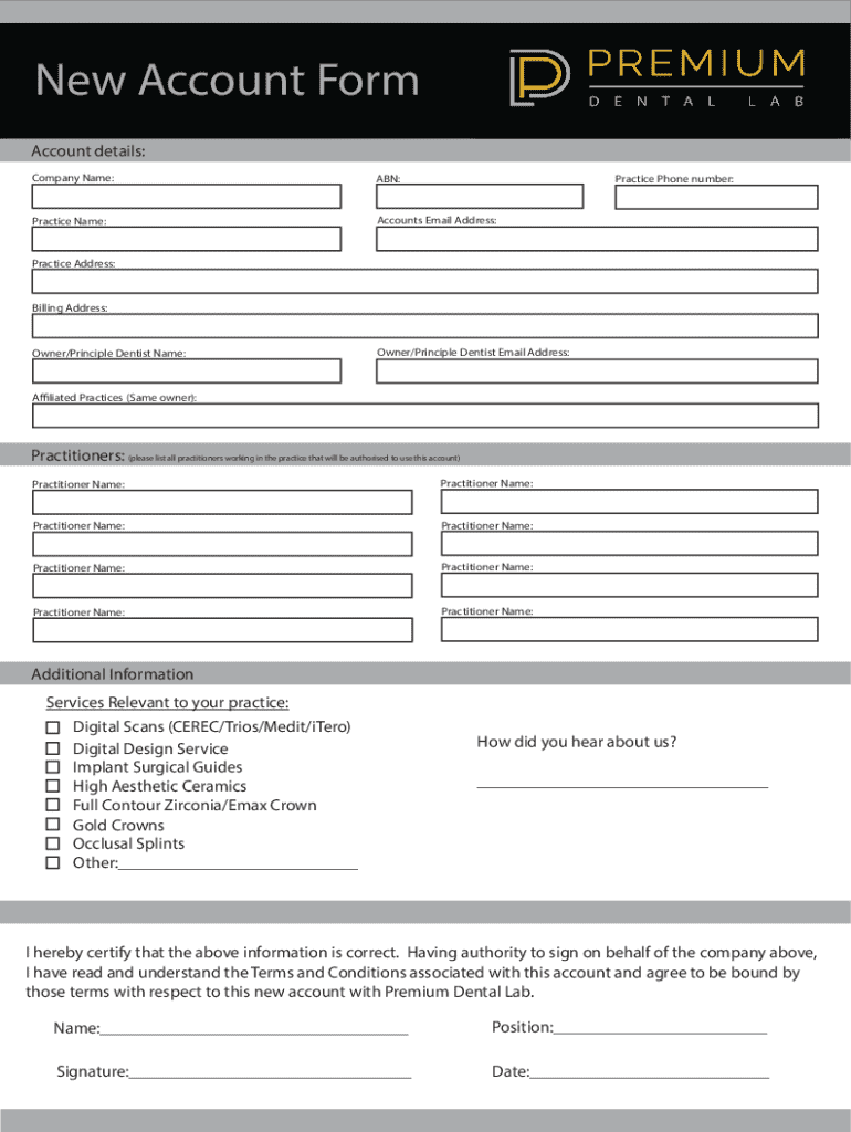 This document serves as a New Account Form for dental practices intending to register with Premium Dental Lab. It includes sections to capture the account details, practice information, practitioner details, and required services offered by the practice. The form also outlines the Terms and Conditions that govern the relationship between the practice and Premium Dental Lab.