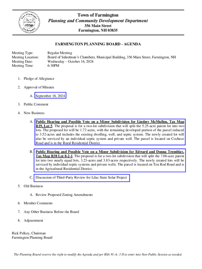 Town of Farmington Planning and Community Development Department 356 Main Street Farmington, NH 03835 FARMINGTON PLANNING BOARD AGENDA Meeting Type: Meeting Location: Meeting Date: Meeting Time:Regular