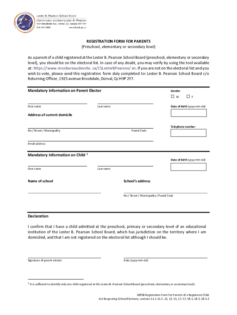 This form is for parents of children registered at the Lester B. Pearson School Board, allowing them to register on the electoral list to be eligible to vote. It collects mandatory information about the parent and their child to ensure proper registration.
