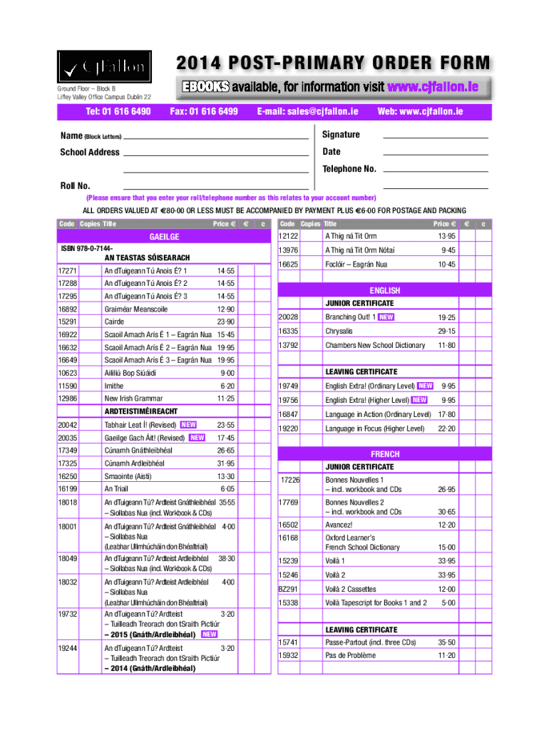 2014 POSTPRIMARY ORDER FORM Ground Floor Block B Liffey Valley Office Campus Dublin 22Tel: 01 616 6490Fax: 01 616 6499Email: sales@cjfallon.ieName (Block Letters)SignatureSchool AddressDateWeb: www.cjfallon.ieTelephone