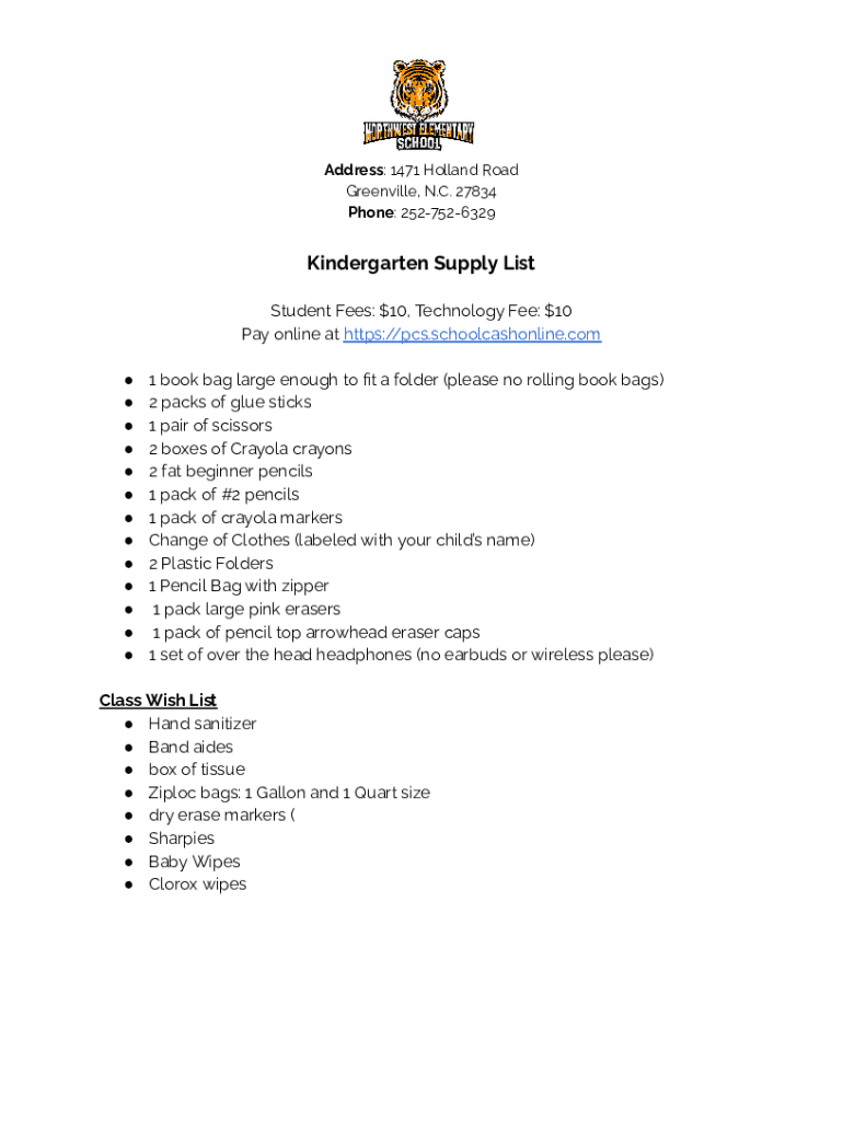 Address: 1471 Holland Road Greenville, N.C. 27834 Phone: 2527526329Kindergarten Supply List Student Fees: $10, Technology Fee: $10 Pay online at https://pcs.schoolcashonline.com 1 book bag large enough