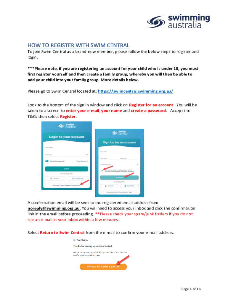 HOW TO REGISTER WITH SWIM CENTRAL To join Swim Central as a brandnew member, please follow the below steps to register and login. ***Please note, if you are registering an account for your child who